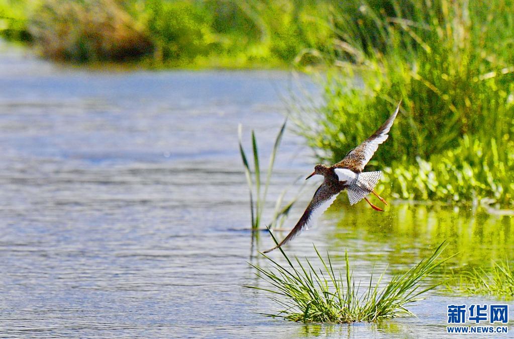 棲息在拉魯濕地核心區裏的紅腳鷸(6月2日攝)。新華社記者 張汝鋒 攝