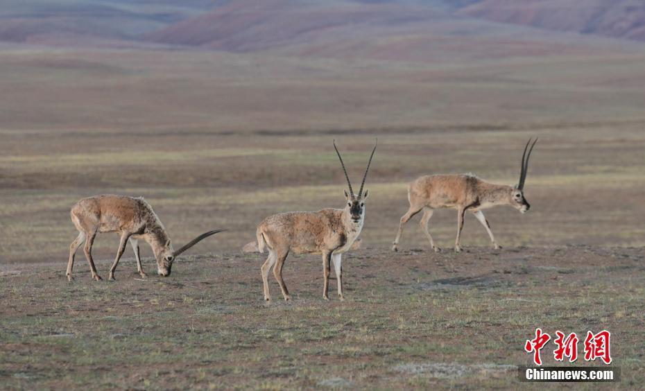 6月17日,西藏那曲羌塘草原上的藏羚羊。羌塘草原位於(yu) 西藏自治區北部,平均海拔超過4600米,是目前中國海拔最高、麵積最大的自然保護區。這裏是野生動物的樂(le) 園,藏羚羊、藏原羚、藏野驢等珍稀野生動物與(yu) 雪山、草地、藍天、白雲(yun) ,構成撼人心魄的壯美畫麵。 中新社記者 貢嘎來鬆 攝