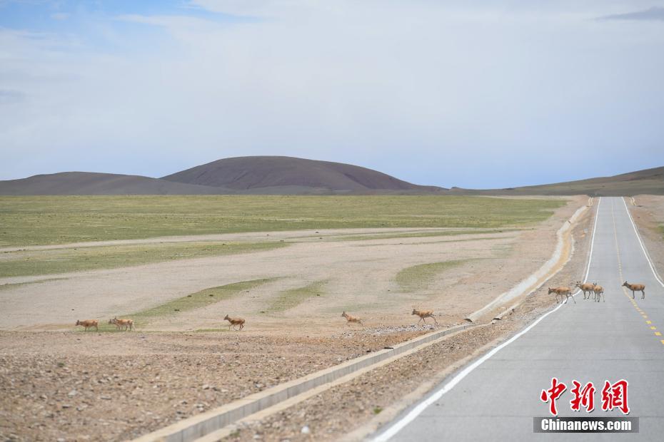 6月20日,藏羚羊群在西藏那曲雙湖縣境內(nei) 穿越公路。羌塘草原位於(yu) 西藏自治區北部,平均海拔超過4600米,是目前中國海拔最高、麵積最大的自然保護區。這裏是野生動物的樂(le) 園,藏羚羊、藏原羚、藏野驢等珍稀野生動物與(yu) 雪山、草地、藍天、白雲(yun) ,構成撼人心魄的壯美畫麵。中新社記者 貢嘎來鬆 攝