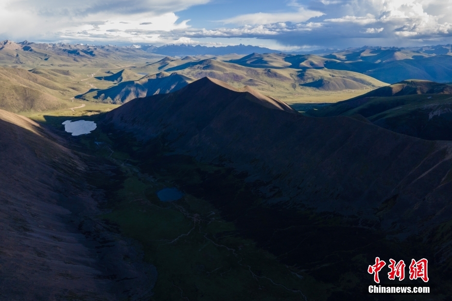 6月23日,思金拉措湖邊高原山脈風光。思金拉措位於(yu) 西藏墨竹工卡縣日多鄉(xiang) ,海拔4500多米,周邊群峰簇擁,地形猶如聚寶盤,不少民眾(zhong) 將其稱為(wei) 西藏的“財神湖”。(無人機照片) 中新社記者 江飛波 攝