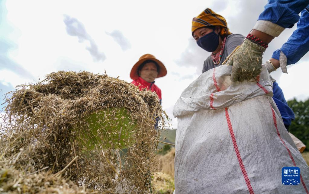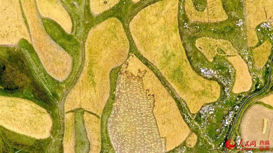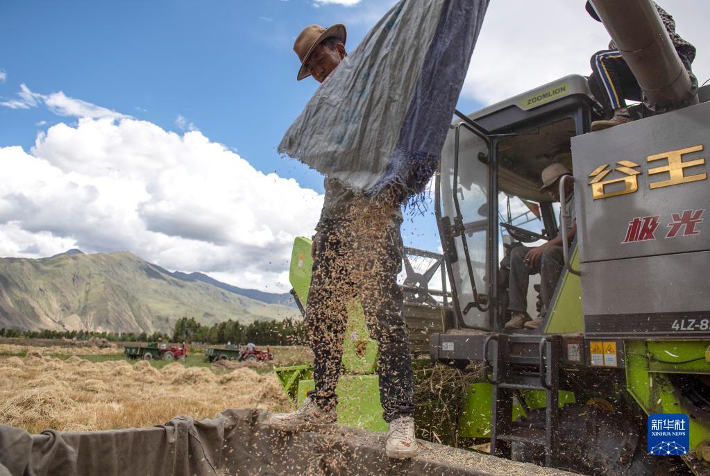 當前正值青稞收獲季節,拉薩河穀一帶農(nong) 民抓緊收割,農(nong) 田裏一片豐(feng) 收的繁忙景象。