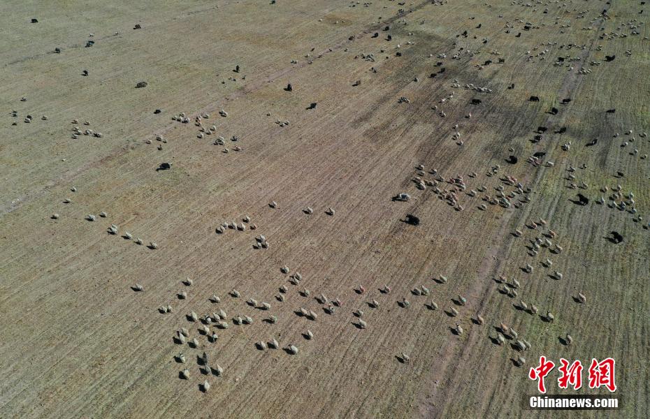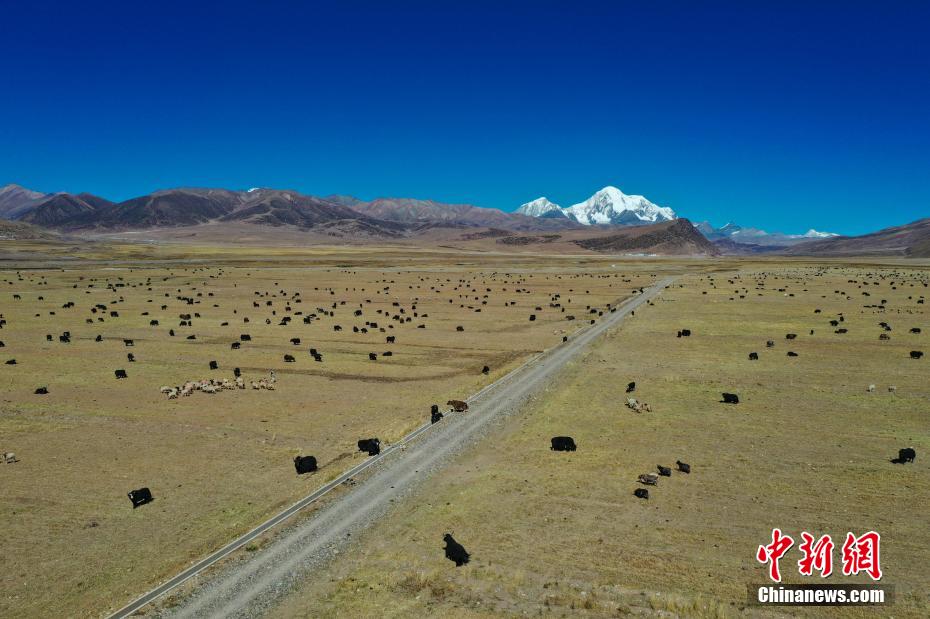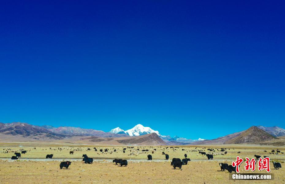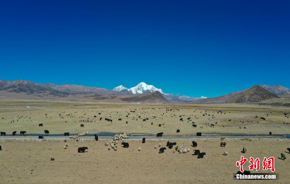 圖為(wei) 瓊穆崗嘎雪山腳下成群結隊的牛羊。(無人機照片) 貢嘎來鬆 攝