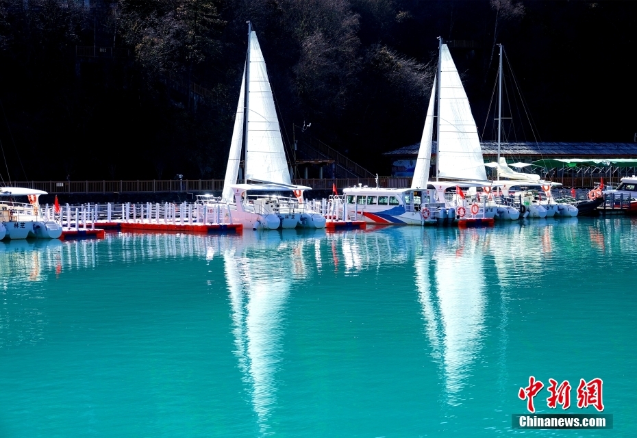 12月2日,巴鬆措湖水綠如翡翠,清澈透亮,帆船靜泊湖邊。巴鬆措位於(yu) 西藏林芝,是西藏海拔最低的大湖。 中新社記者 冉文娟 攝