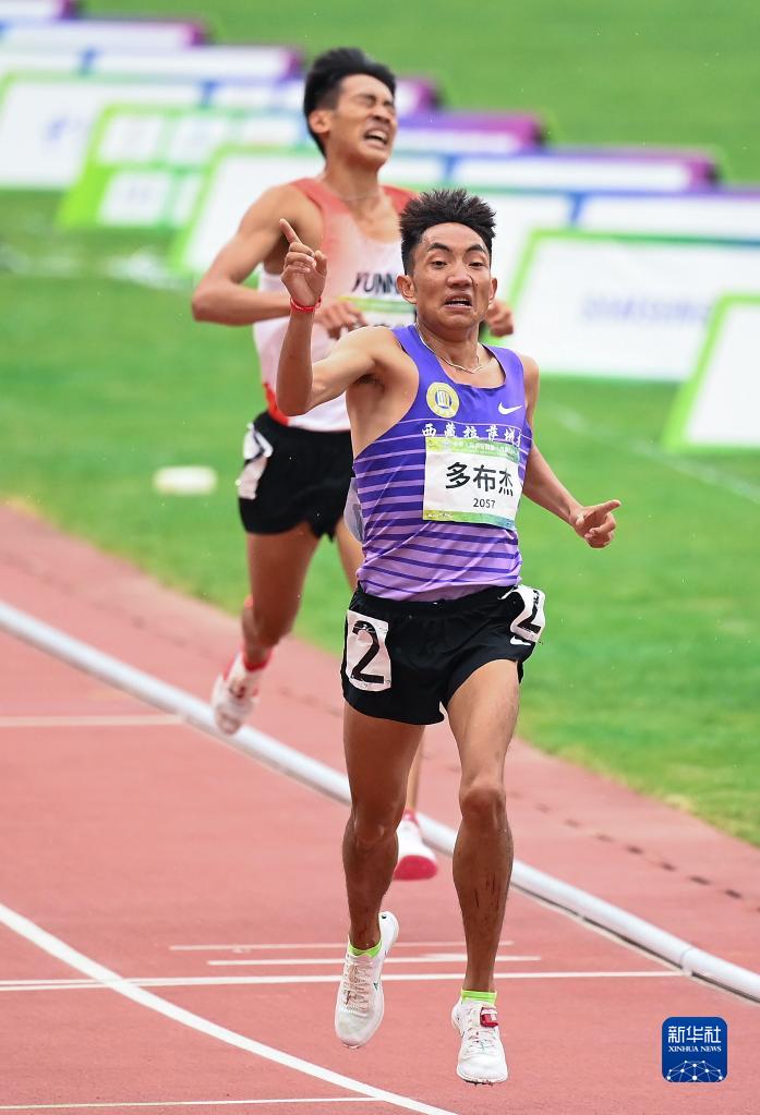 在第十四屆全運會(hui) 田徑項目男子5000米決(jue) 賽中,西藏隊選手多布傑(前)以13分49秒16的成績奪冠(2021年9月23日攝)。新華社記者 宋彥樺 攝