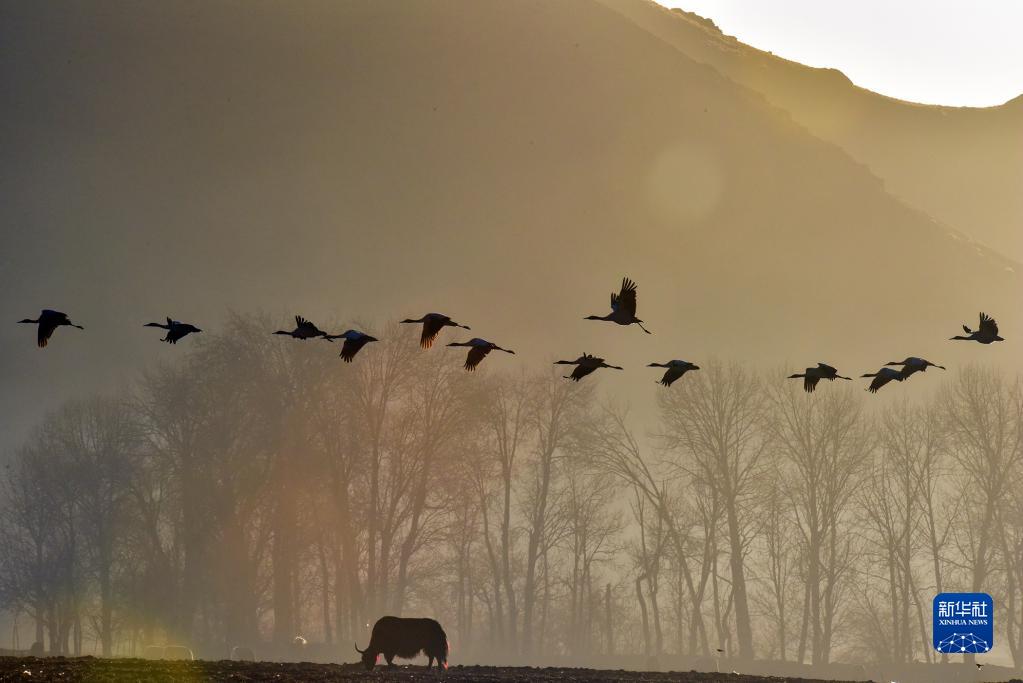 黑頸鶴在拉薩市林周縣飛翔(1月8日攝)。新華社記者 黃豁 攝