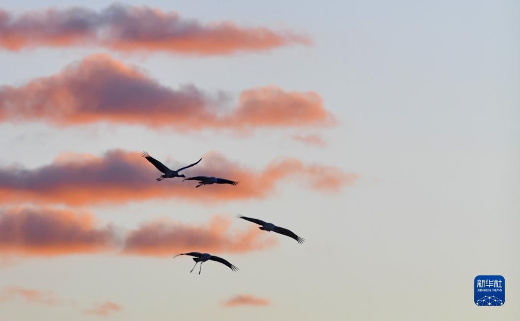 黑頸鶴在拉薩市林周縣上空飛翔(1月9日攝)。新華社記者 張汝鋒 攝