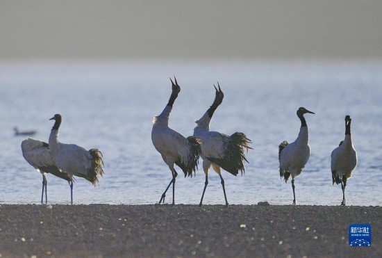 黑頸鶴在拉薩市林周縣農(nong) 田裏起舞(1月8日攝)。新華社記者 張汝鋒 攝