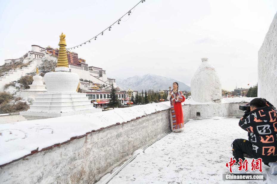 2月21日,遊客穿著藏族傳(chuan) 統服飾在布達拉宮拍照留念。當日,西藏拉薩市迎來降雪,雪後的拉薩城區和周圍群山白雪皚皚,風景如畫。 中新社記者 貢嘎來鬆 攝