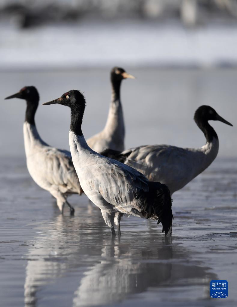 在拉薩市林周縣境內(nei) 越冬的黑頸鶴(2月22日攝)。新華社記者 薑帆 攝