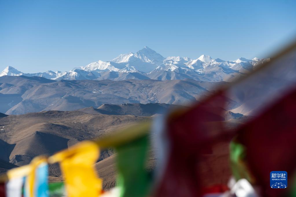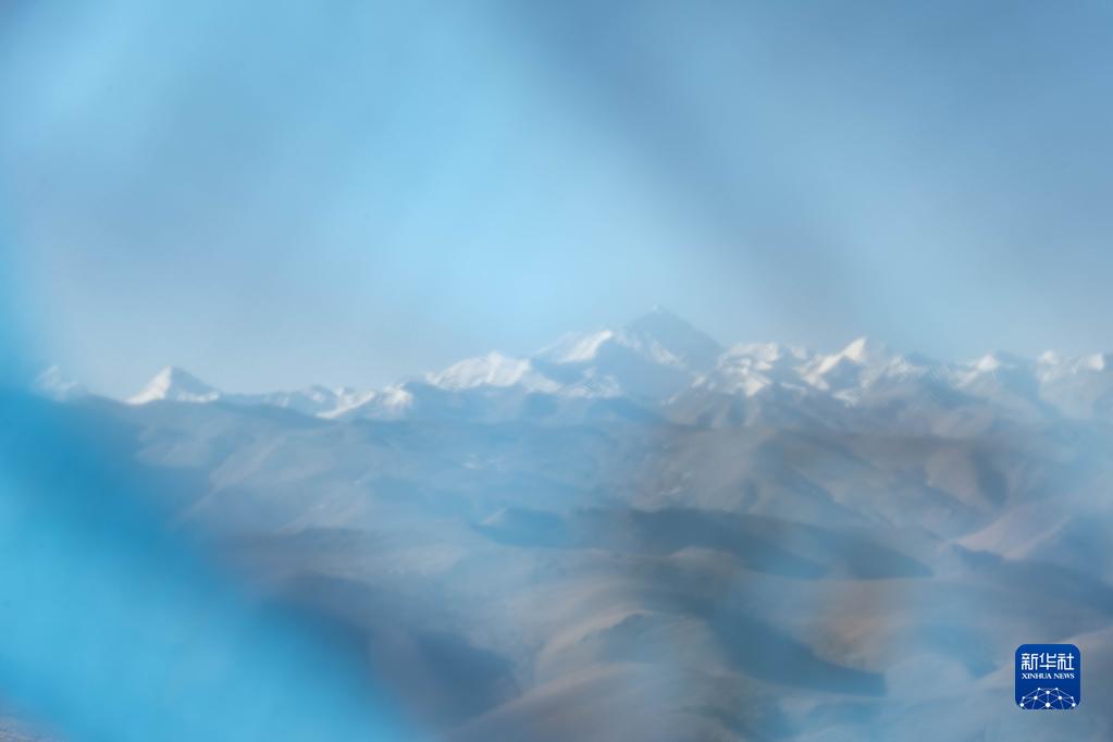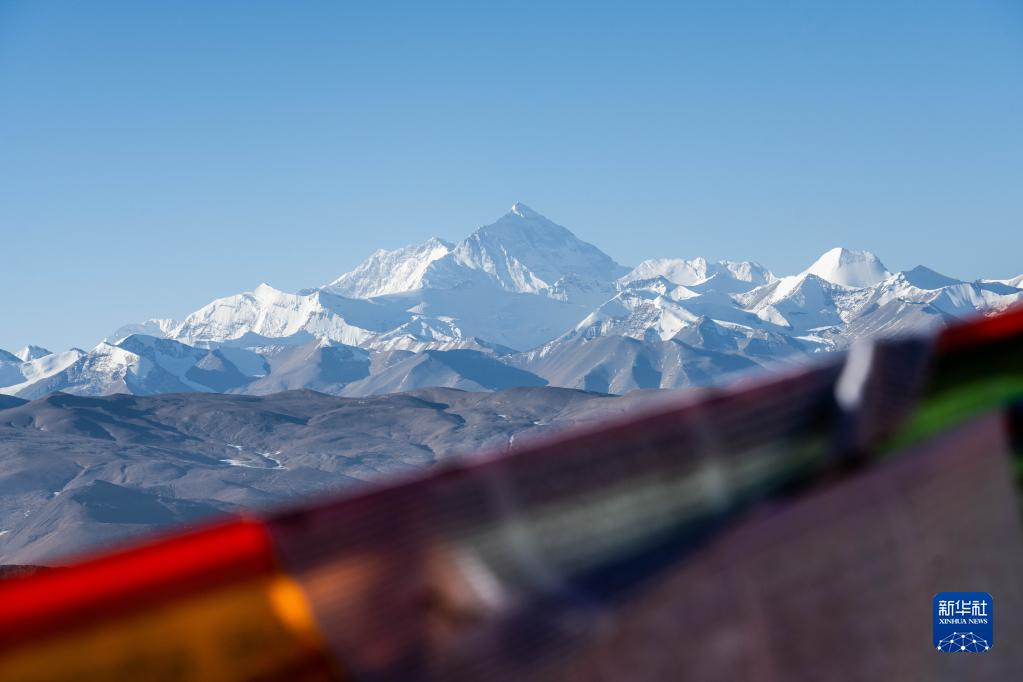 這是3月15日在西藏日喀則透過藍色經幡拍攝的珠穆朗瑪峰。新華社記者 周荻瀟 攝