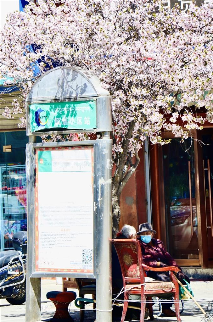 住在拉薩靠北邊的市民同樣能一飽眼福。娘熱北路兩(liang) 側(ce) 的榆葉梅已全部綻放,而緊鄰娘熱路的慈鬆塘中路和慈鬆塘東(dong) 路更是一片春花爛漫的美好景象。慈鬆塘中路和北路的榆葉梅栽種較為(wei) 密集,成團成簇的淡粉色花朵擠在枝頭,樹下乘涼的老奶奶、樹邊停靠的公交車,在花朵的加持下,隨手一拍便是故事感極強的畫麵。