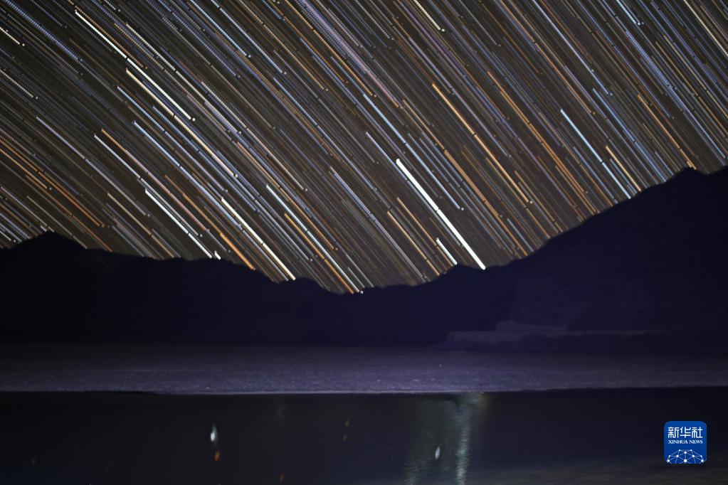 這是4月6日在班公湖畔拍攝的星軌(合成照片)。新華社記者 薑帆 攝