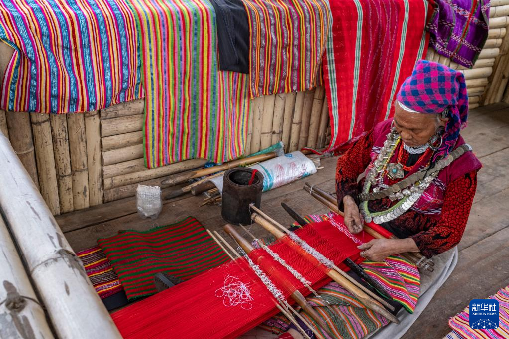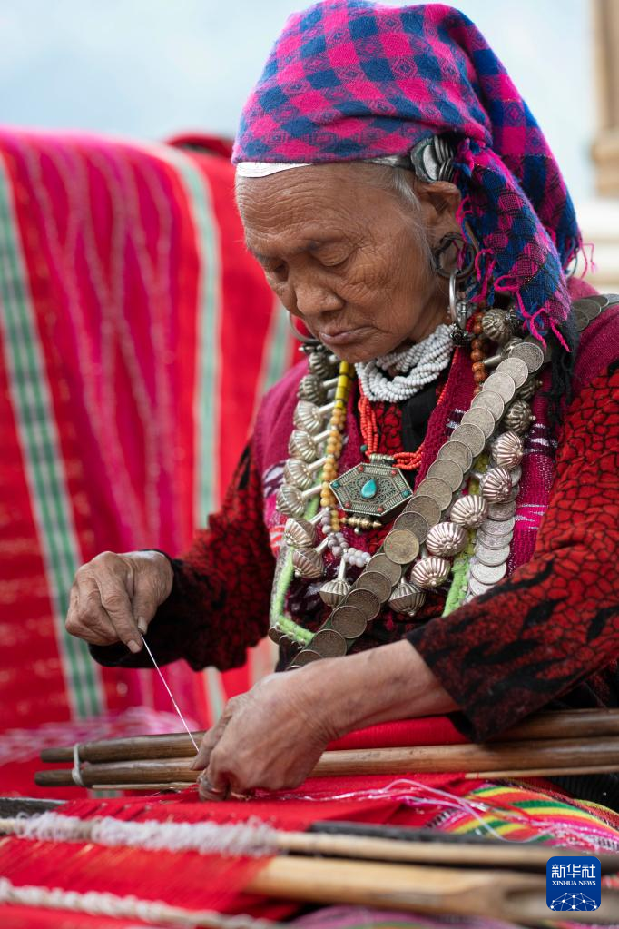 今年72歲的本央老人,是僜人服飾製作技藝西藏自治區級非遺傳(chuan) 承人。在西藏林芝市察隅縣沙瓊村,老人身著傳(chuan) 統的僜人服飾,在自家的涼亭裏編織布料。