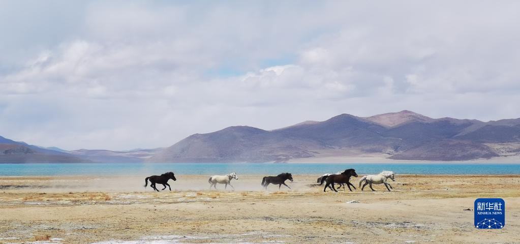 馬群在位於(yu) 西藏自治區日喀則市聶拉木縣境內(nei) 的佩枯錯旁奔跑(2021年5月14日攝,手機照片)。新華社記者 沈虹冰 攝