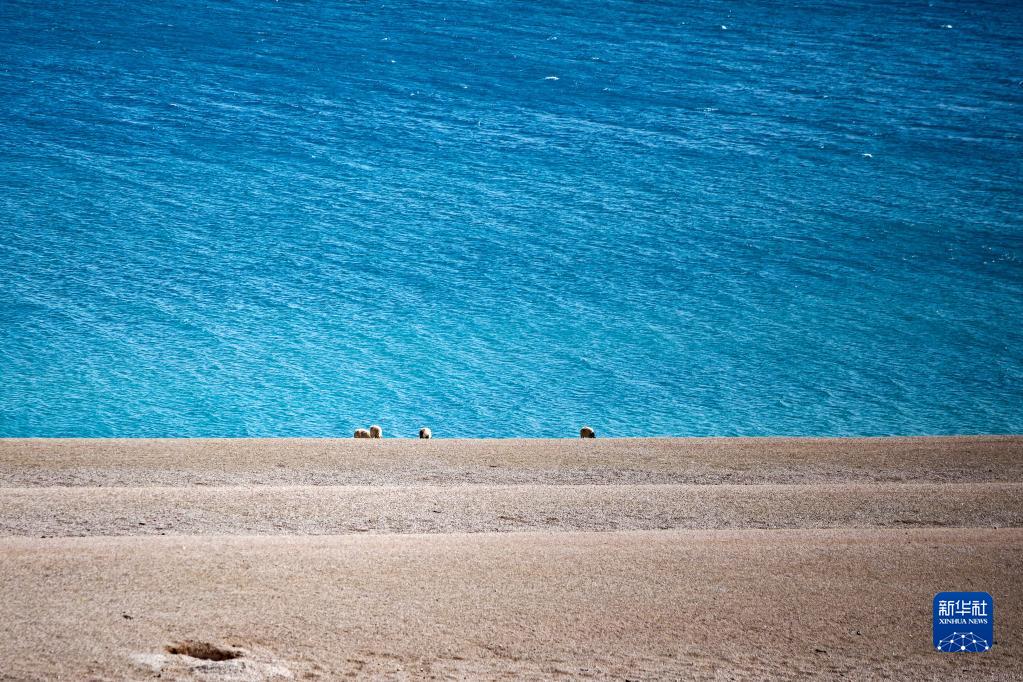 在位於(yu) 西藏自治區那曲市的巴木錯,羊群在湖邊吃草(2022年4月13日攝,手機照片)。新華社記者 沈虹冰 攝