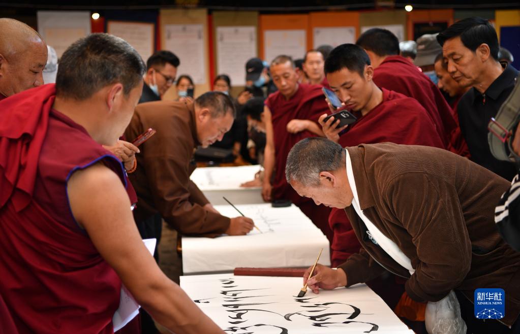 4月28日,拉薩大昭寺僧人與(yu) 書(shu) 法家切磋技藝。新華社記者 覺果 攝