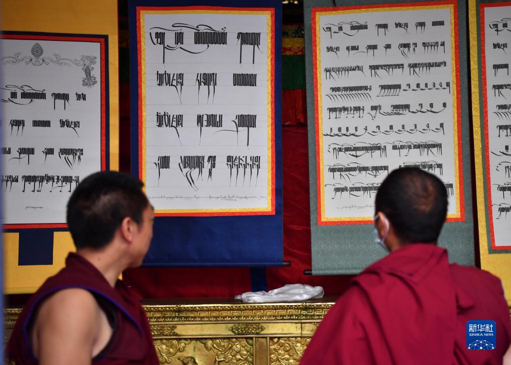 4月28日,拉薩大昭寺僧人觀看書(shu) 法作品展。新華社記者 覺果 攝