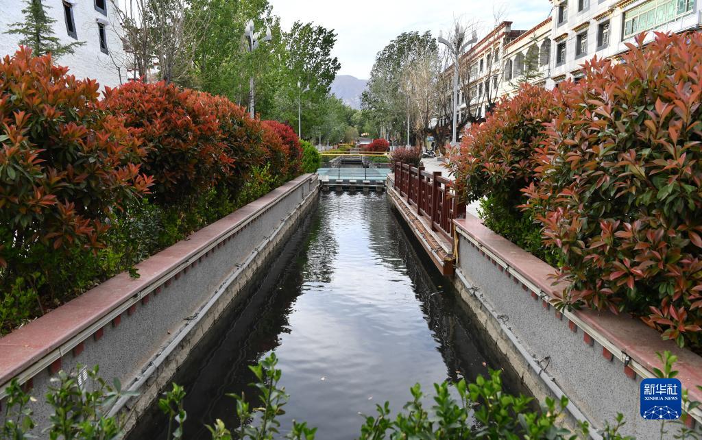 拉薩市崗廓路與(yu) 江蘇大道交叉口附近的水係景觀(5月7日攝)。新華社記者 晉美多吉 攝