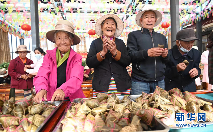 6月3日,在西藏山南市集中供養(yang) 服務中心,老人們(men) 品嚐美味的粽子。新華網發(許國 攝)
