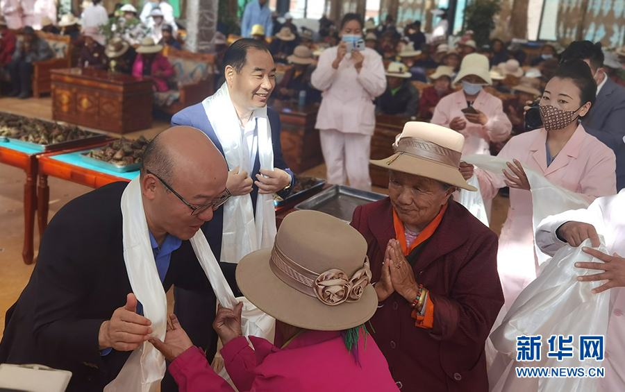 6月3日,西藏山南市集中供養(yang) 服務中心內(nei) ,老人向安徽第七批援藏工作隊的隊員獻上潔白的哈達。新華網 王雷 攝