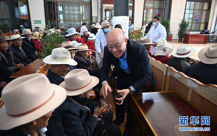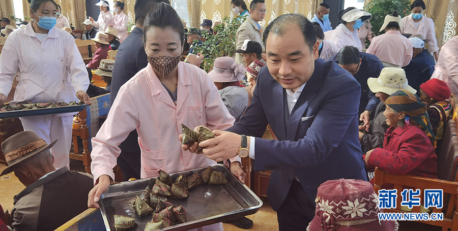 6月3日,在西藏山南市集中供養(yang) 服務中心,安徽第七批援藏工作隊隊長汪華東(dong) 為(wei) 孤寡老人送上粽子。新華網 王雷 攝