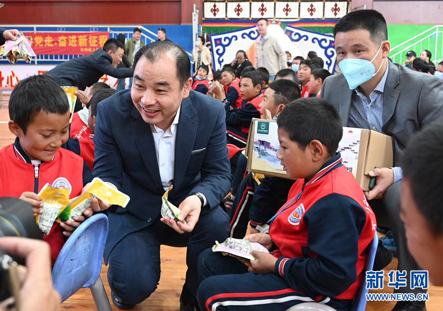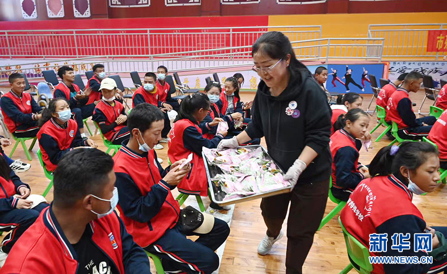6月3日,在西藏山南市特教學校,安徽岸香集團董事長黃保鎖為(wei) 孩子們(men) 分發粽子。新華網發(許國 攝)