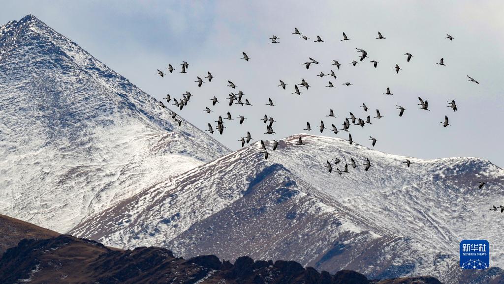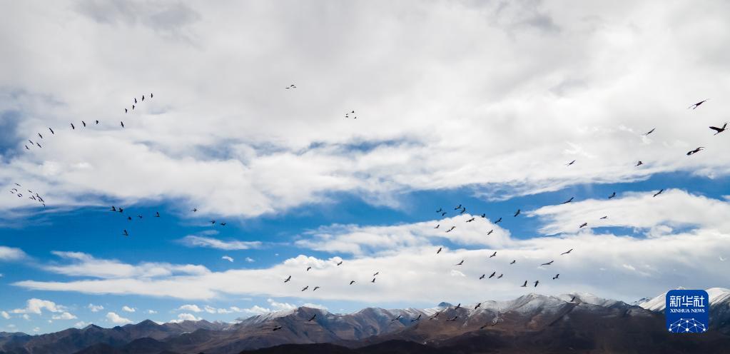 黑頸鶴群飛過林周縣強嘎鄉(xiang) 境內(nei) 山梁(11月6日攝)。新華社記者 薑帆 攝