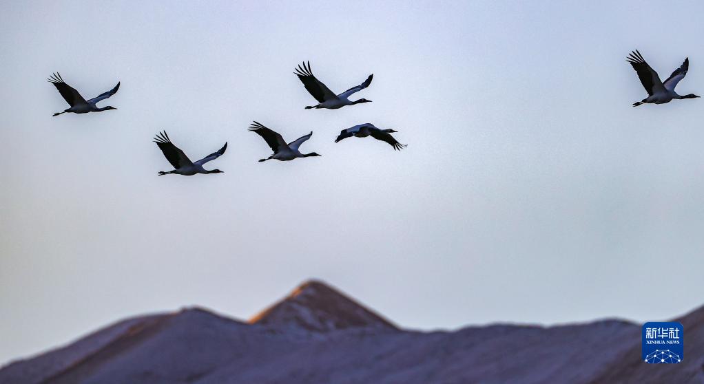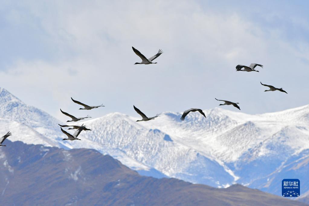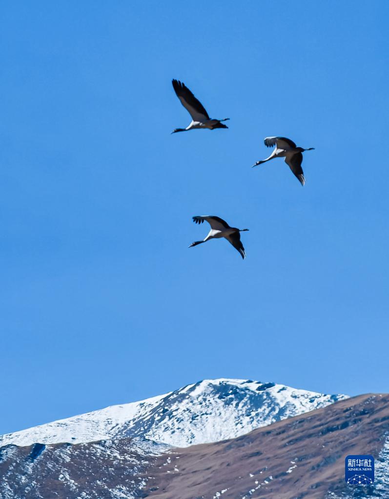 黑頸鶴在林周縣強嘎鄉(xiang) 上空飛翔(11月6日攝)。新華社記者 周荻瀟 攝