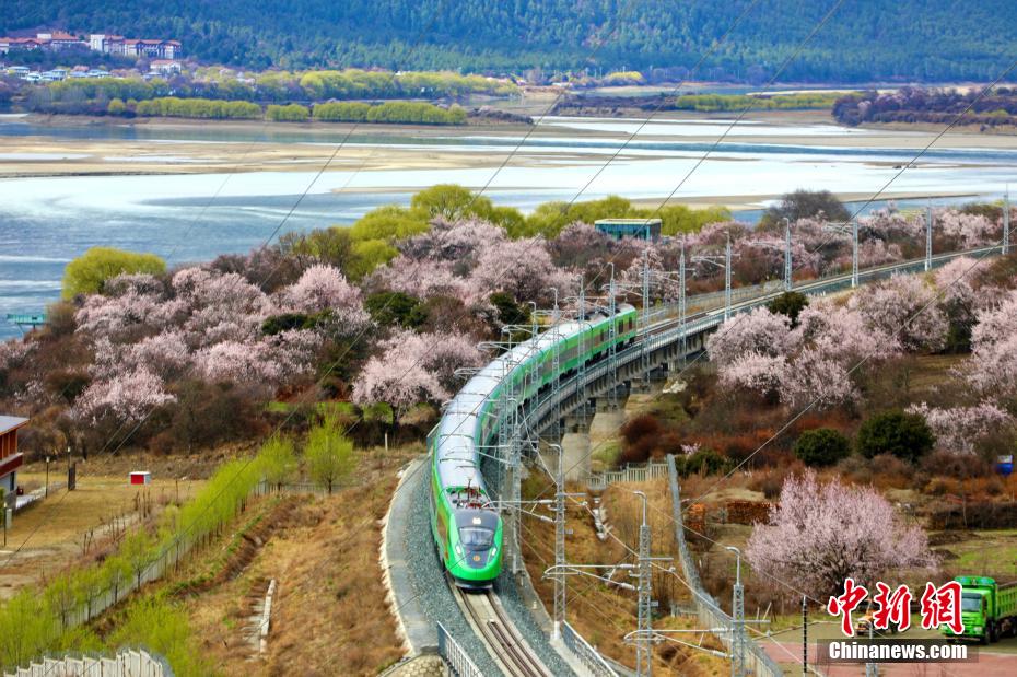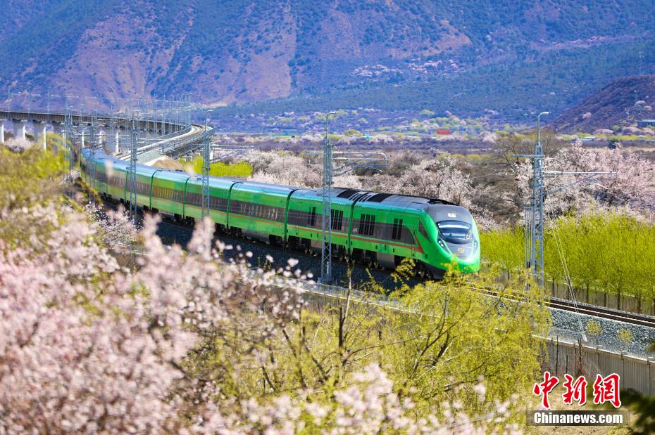 穿梭在桃花林中的拉林鐵路高原複興(xing) 號。