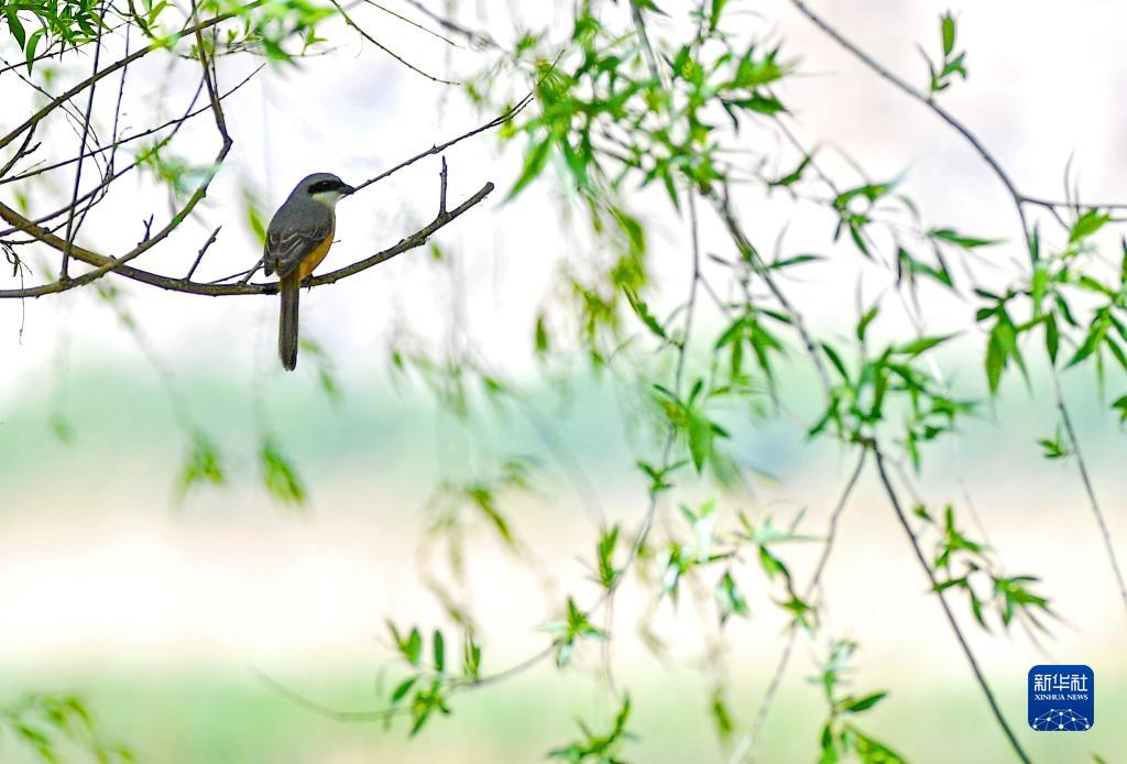 拉魯濕地樹枝上一隻四處觀望的灰背伯勞(5月6日攝)。新華社記者 張汝鋒 攝