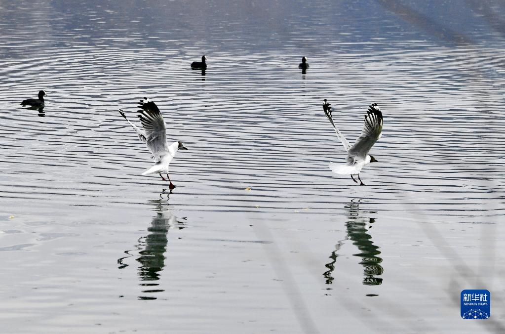 拉魯濕地水麵上叼著泥鰍的棕頭鷗(5月6日攝)。新華社記者 張汝鋒 攝