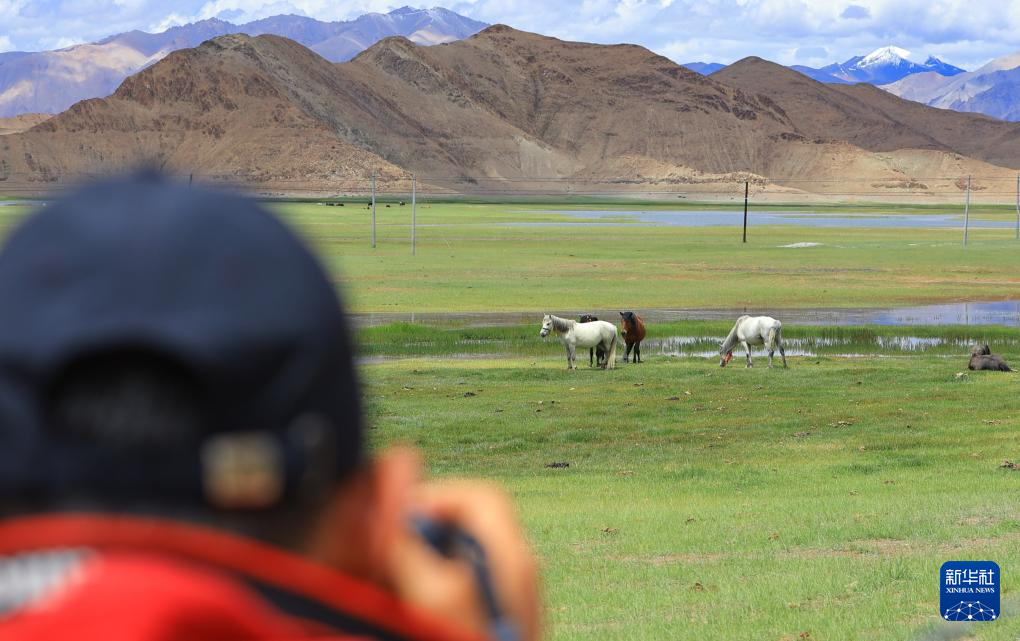 遊客拍攝班公湖畔的駿馬(7月28日攝)。新華社記者 關(guan) 明輝 攝