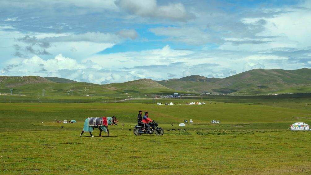 8月11日,馴馬人騎摩托車在羌塘草原上遛馬。新華社記者 陳澤鵬 攝