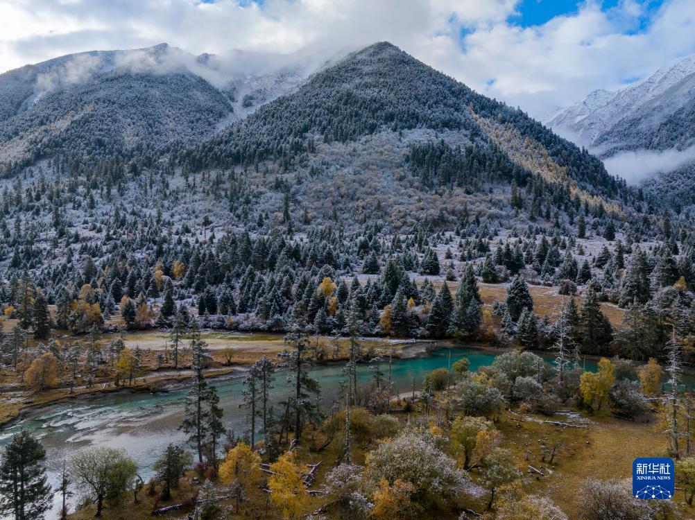 時值金秋,西藏林芝市秋色已濃,黃葉與(yu) 初雪交織,流水並雪山輝映,景色如詩如畫。