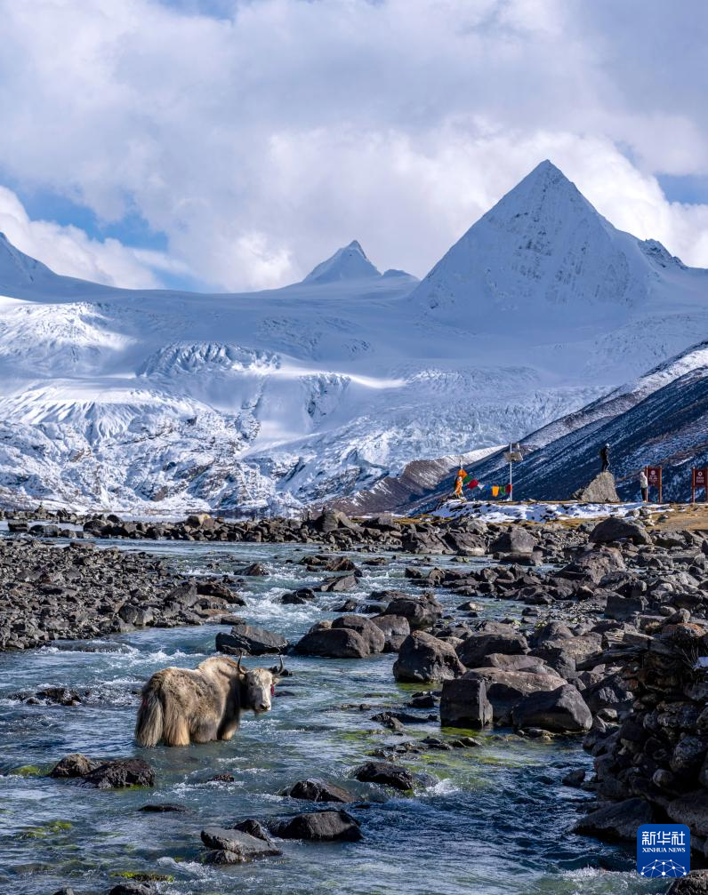 一頭犛牛站在薩普雪山腳下的河流裏(10月28日攝)。新華社記者 孫非 攝