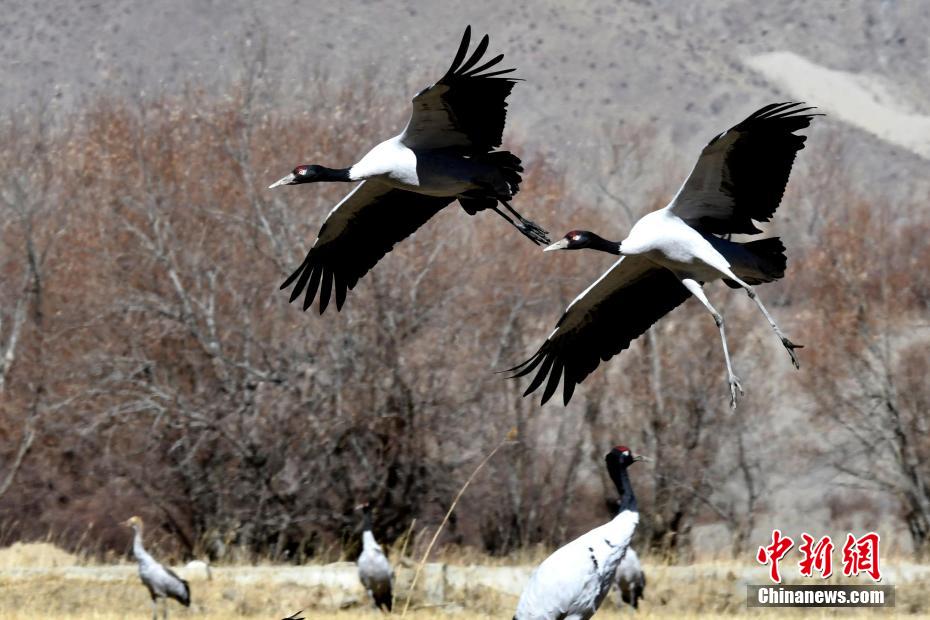圖為(wei) 11月21日,西藏日喀則市桑珠孜區邊雄鄉(xiang) ,黑頸鶴振翅高飛。李林 攝