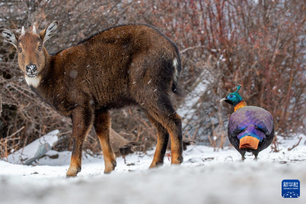 1月17日拍攝於(yu) 西藏山南市洛紮縣的喜馬拉雅斑羚和棕尾虹雉等野生動物。新華社記者 旦增尼瑪曲珠 攝