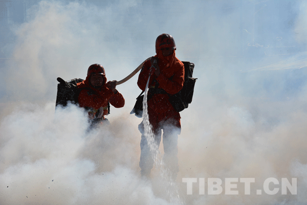 圖為(wei) 官兵在演練中用滅火裝備壓製火頭