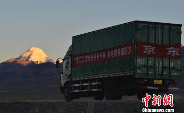 圖為(wei) 京東(dong) 家電配送車在前往西藏阿裏地區的途中 攝影:李林圖片來源:中新網