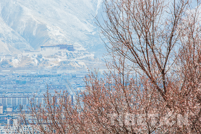 圖為(wei) 從(cong) 拉薩市北郊山坡上的帕崩崗遠眺布達拉宮。