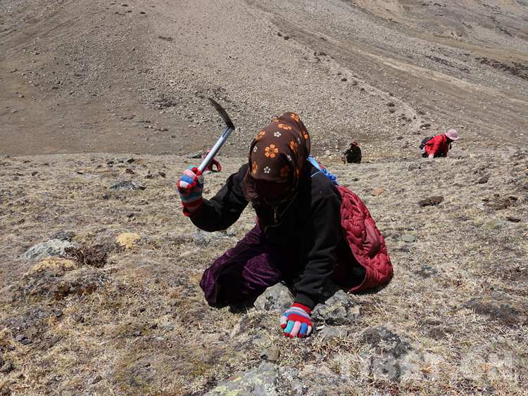 圖為(wei) 村民次仁措姆好像找到了一根蟲草。