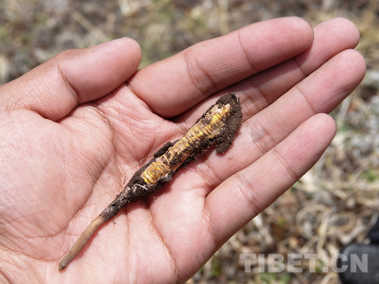 圖為(wei) 次仁措姆剛剛挖到的一根蟲草。