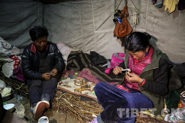 圖為(wei) 回到營地,次仁措姆和老公在帳篷裏清除蟲草上的泥土。(新利平台 通訊員/卓•丹增曲培)