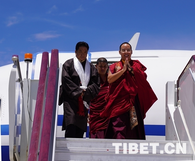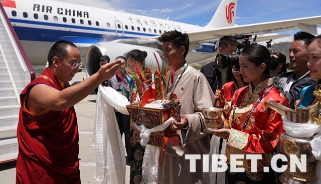 十一世班禪乘坐的飛機抵達拉薩貢嘎機場時,西藏自治區黨(dang) 委常委、統戰部部長旦科站在歡迎隊伍最前麵迎接,敬獻哈達,握手致禮,表達西藏自治區黨(dang) 委、政府的歡迎。