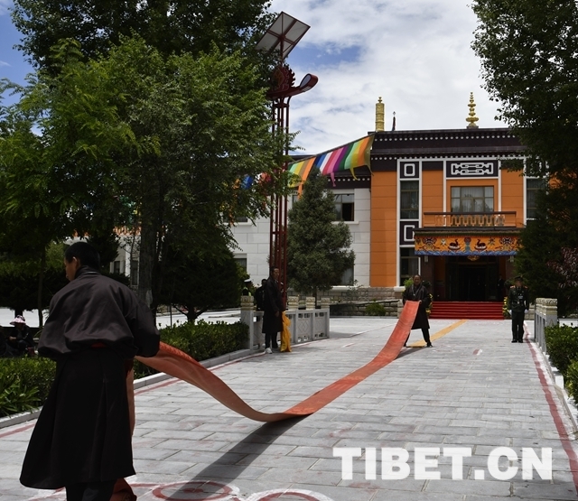 在位於(yu) 拉薩市區的班禪行宮雪林多吉頗章大院內(nei) ,一場更加熱烈的儀(yi) 式也即將進行。在雪林多吉頗章主殿前,僧人們(men) 提前繪製了金剛結等吉祥圖案,一條尺許寬的地毯從(cong) 歡迎隊伍處一直延伸到主殿門前。來自拉薩各大寺廟的僧眾(zhong) 代表和拉薩信教群眾(zhong) 代表,帶著虔誠和喜悅的心情,翹首以盼十一世班禪的到來。