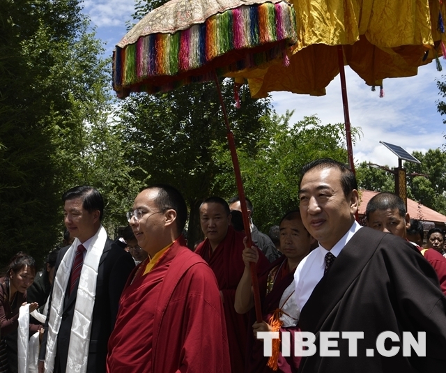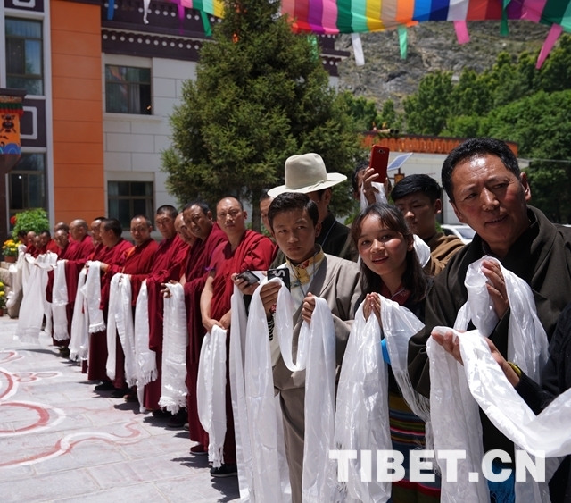 當大院內(nei) 響起法號聲時,早已在此等候的僧俗信教群眾(zhong) 紛紛翹首踮足,盼望一睹十一世班禪的風采。十一世班禪剛下車,高僧們(men) 手持香爐,打著幡幛、華蓋,吹奏佛樂(le) ,以藏傳(chuan) 佛教最隆重的禮儀(yi) 迎接班禪額爾德尼•確吉傑布的到來。身著藏族傳(chuan) 統盛裝的男女青年,向十一世班禪敬獻象征吉祥如意的“切瑪”,表達拉薩各族各界人士和僧俗信教群眾(zhong) 的美好祝願。在此等候的自治區有關(guan) 領導也與(yu) 十一世班禪互敬哈達、互致問候。