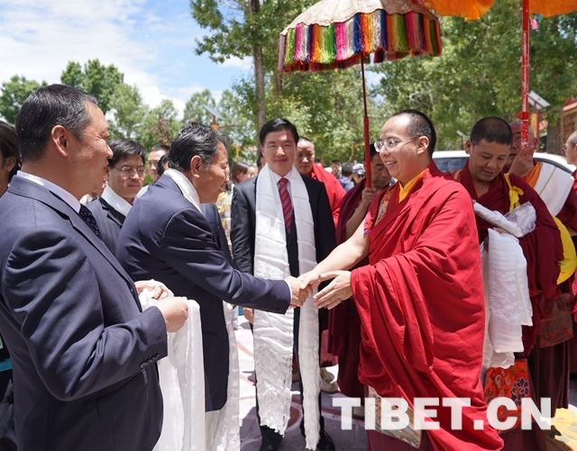 圖為(wei) 西藏自治區有關(guan) 領導與(yu) 十一世班禪互敬哈達、互致問候。攝影:王淑