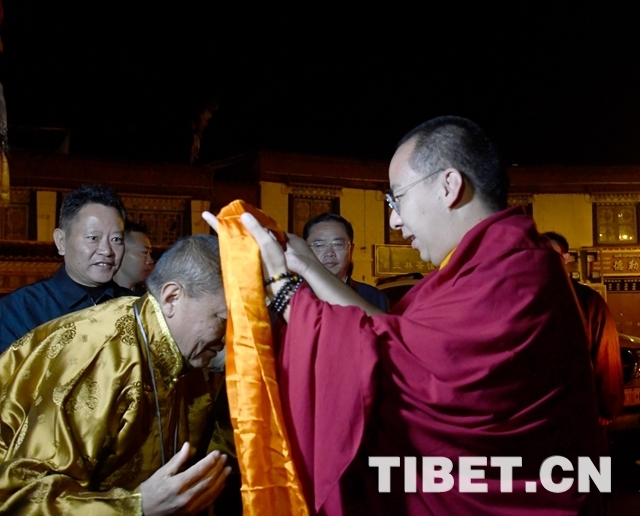 十一世班禪乘車抵達大昭寺時法號齊鳴、鼓樂(le) 喧天。早已迎候在此的中國佛協西藏分會(hui) 會(hui) 長珠康•土登克珠向十一世班禪敬獻哈達,表達僧眾(zhong) 對他的衷心擁戴。