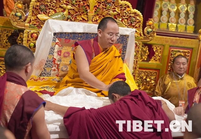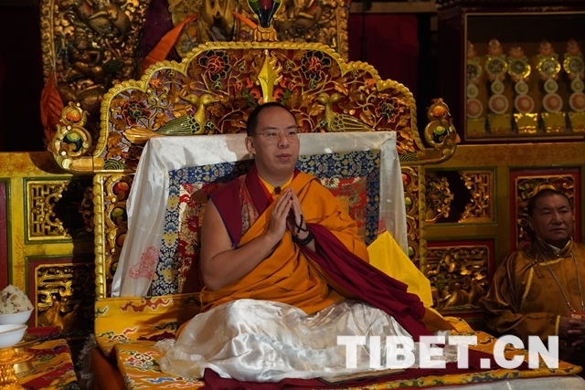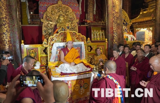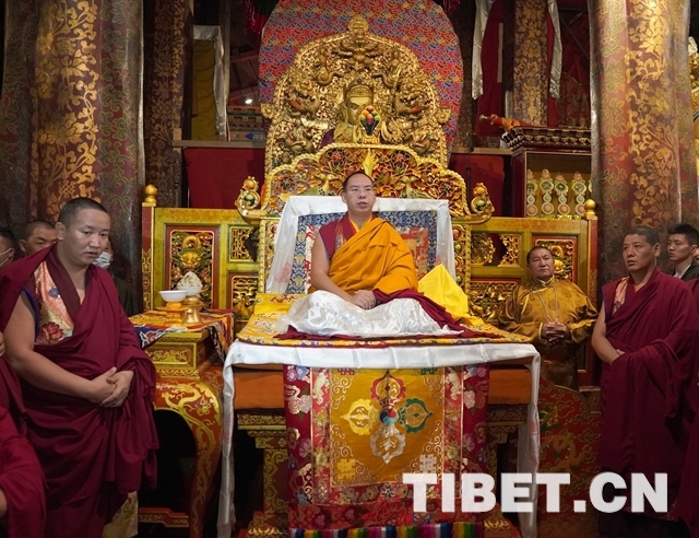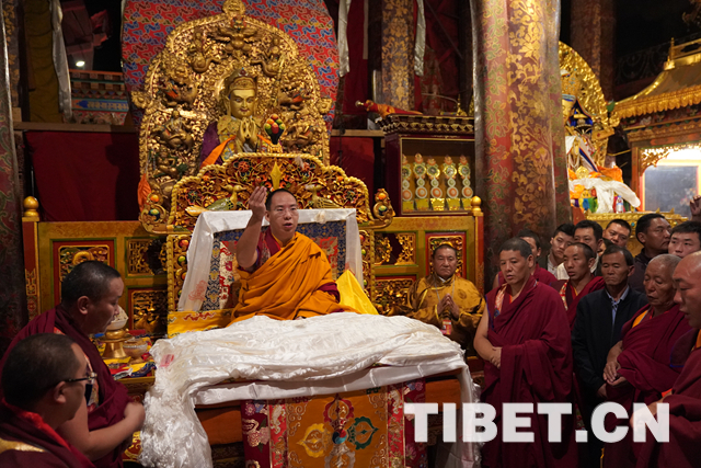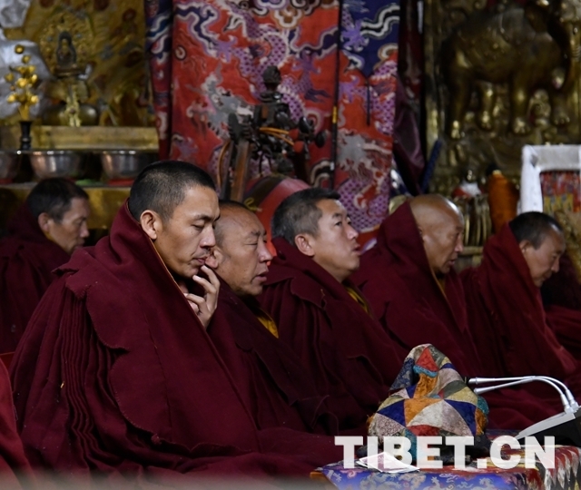 朝拜結束後,十一世班禪登上設在釋迦牟尼佛像正對麵的寶座上,麵朝佛像,帶領眾(zhong) 僧念誦經文,祈願五穀豐(feng) 登、國泰民安、世界和平。