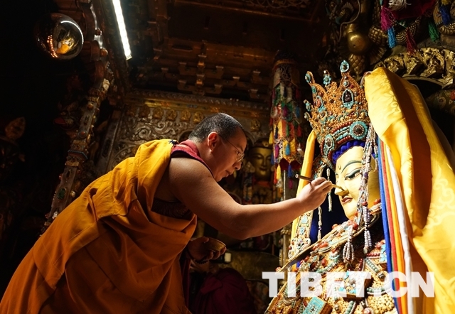 圖為(wei) 十一世班禪為(wei) 釋迦牟尼十二歲等身佛像麵部塗繪金粉。攝影:王淑